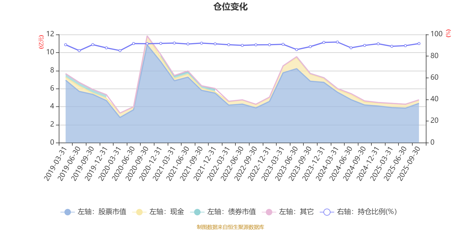 据定期报告数据统计,近三年平均股票仓位为90.13%,同类平均为72.35%。2024年一季度末基金达到93.02%的最高仓位,2019年上半年末最低,为85.1%。