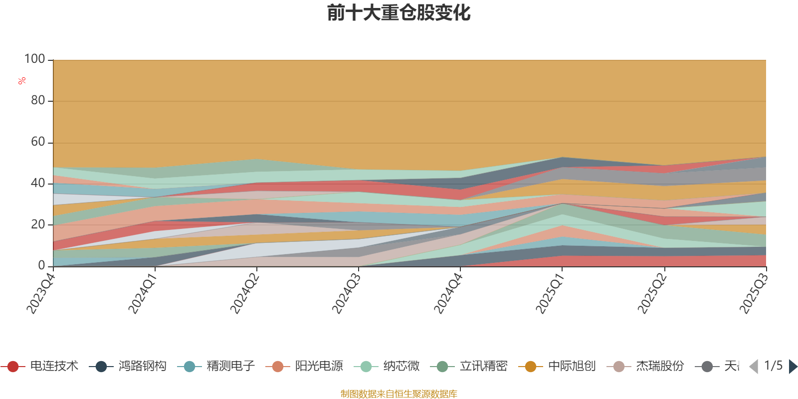 截至2025年三季度末,基金十大重仓股分别是中微公司、思特威、广联达、立讯精密、电连技术、银轮股份、中际旭创、鸿路钢构、芯碁微装、杰瑞股份。