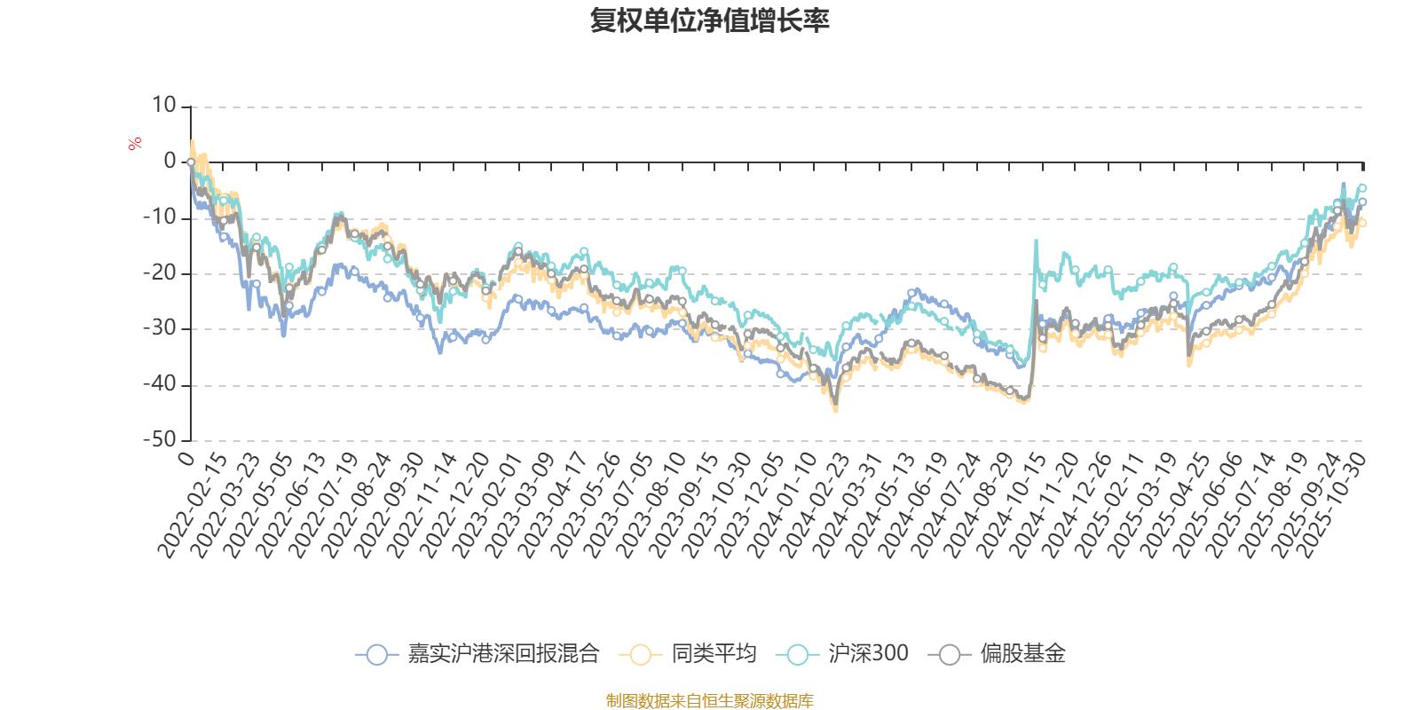 截至10月30日,嘉实沪港深回报混合近三个月复权单位净值增长率为15.88%,位于同类可比基金120/265;近半年复权单位净值增长率为25.47%,位于同类可比基金162/265;近一年复权单位净值增长率为31.43%,位于同类可比基金114/265;近三年复权单位净值增长率为40.46%,位于同类可比基金54/253。