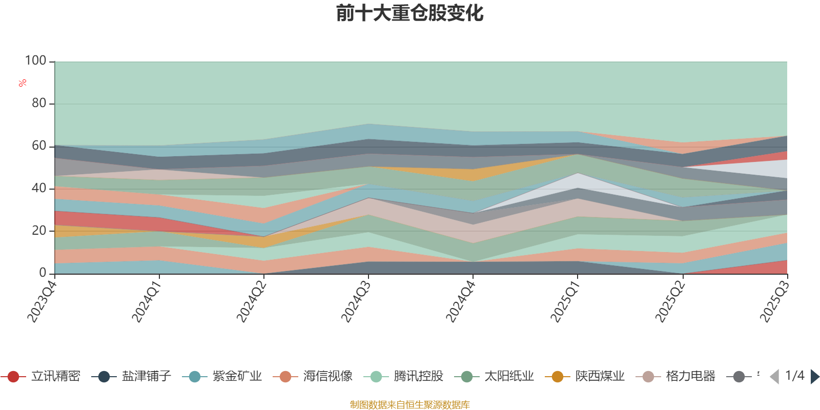 该基金持股集中度较高,近2年前十大重仓股集中度长期超过60%。截至2025年三季度末,基金十大重仓股分别是阿里巴巴-W、腾讯控股、紫金矿业、纽威股份、招金矿业、立讯精密、海丰国际、海信视像、舜宇光学科技、山东黄金。