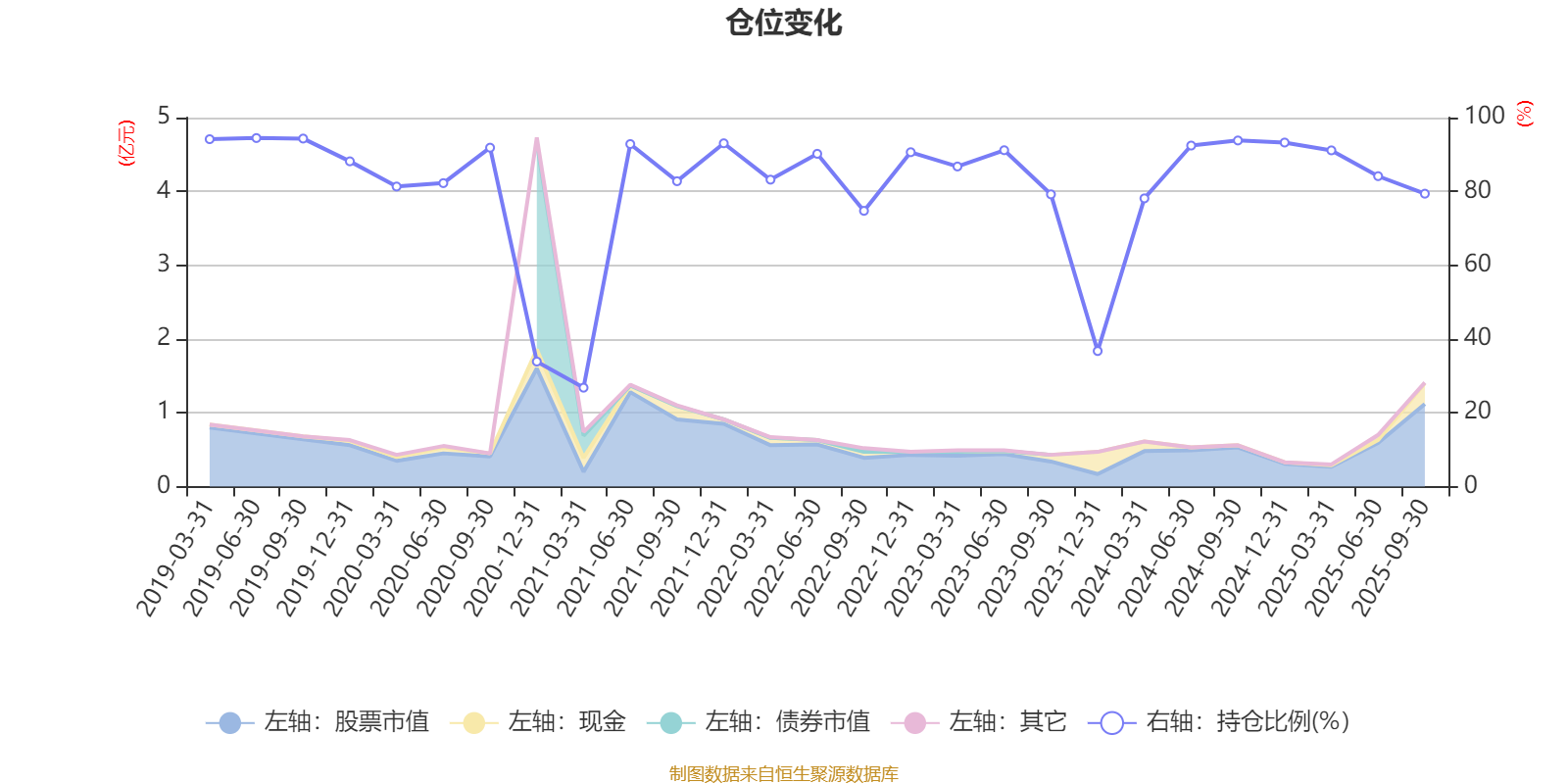 据定期报告数据统计,近三年平均股票仓位为83.06%,同类平均为72.35%。2019年上半年末基金达到94.46%的最高仓位,2021年一季度末最低,为26.8%。
