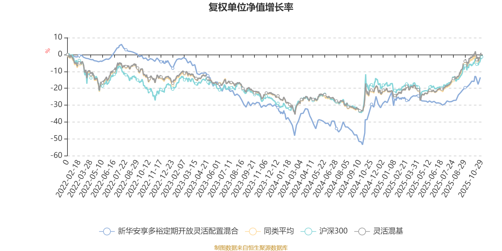 截至10月24日,新华安享多裕定期开放灵活配置混合近三个月复权单位净值增长率为19.82%,位于同类可比基金368/1287;近半年复权单位净值增长率为19.28%,位于同类可比基金779/1287;近一年复权单位净值增长率为31.25%,位于同类可比基金391/1287;近三年复权单位净值增长率为-10.98%,位于同类可比基金1162/1286。