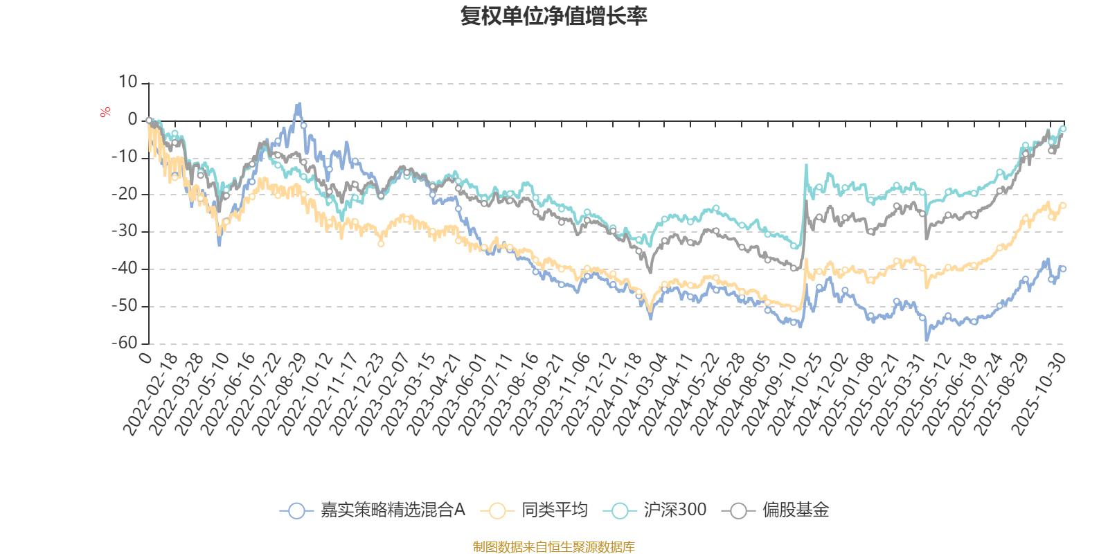 截至10月30日,嘉实策略精选混合A近三个月复权单位净值增长率为17.91%,位于同类可比基金231/621;近半年复权单位净值增长率为30.74%,位于同类可比基金280/621;近一年复权单位净值增长率为10.46%,位于同类可比基金557/611;近三年复权单位净值增长率为-31.37%,位于同类可比基金514/518。
