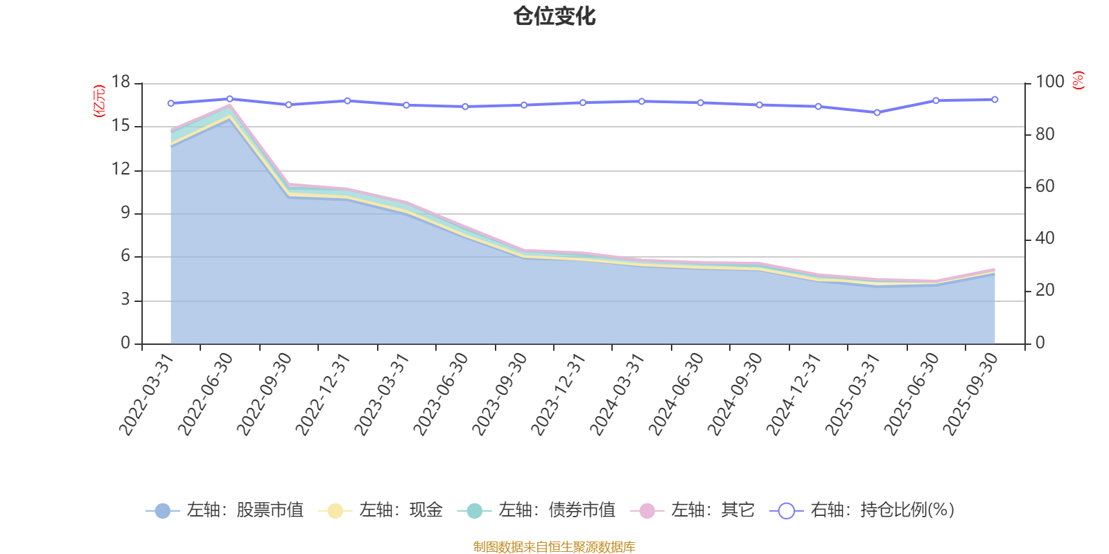 据定期报告数据统计,近三年平均股票仓位为91.98%,同类平均为85.66%。2022年上半年末基金达到93.97%的最高仓位,2025年一季度末最低,为88.7%。