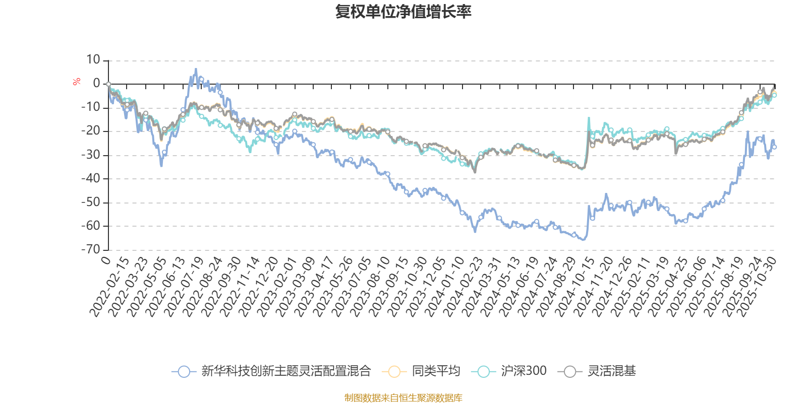 截至10月30日,新华科技创新主题灵活配置混合近三个月复权单位净值增长率为27.09%,位于同类可比基金204/1287;近半年复权单位净值增长率为68.67%,位于同类可比基金73/1287;近一年复权单位净值增长率为56.31%,位于同类可比基金114/1287;近三年复权单位净值增长率为-8.16%,位于同类可比基金1132/1286。
