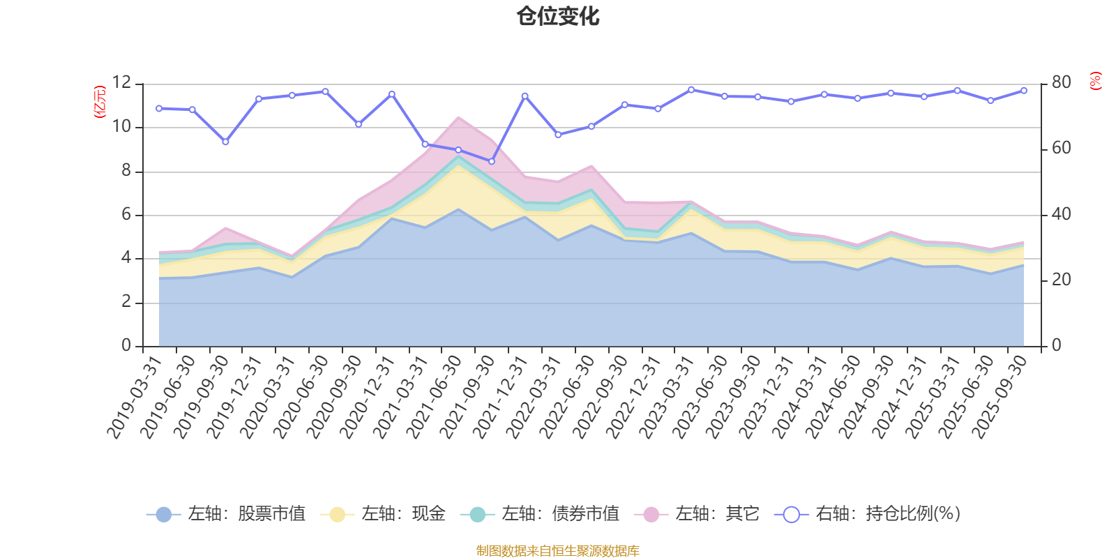 据定期报告数据统计,近三年平均股票仓位为76.12%,同类平均为72.35%。2023年一季度末基金达到78.16%的最高仓位,2021年三季度末最低,为56.32%。