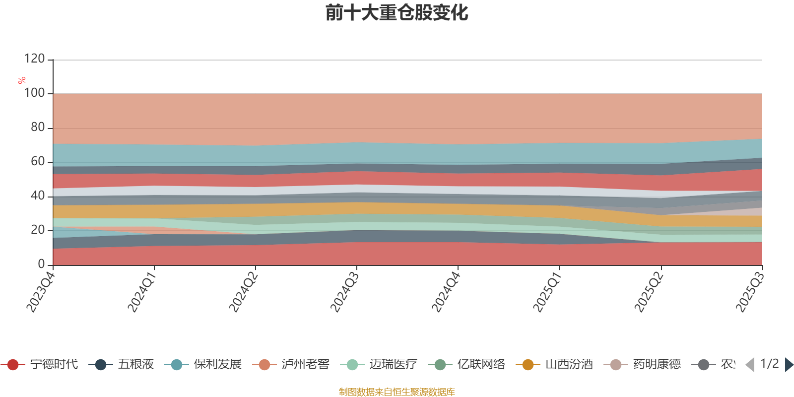 该基金持股集中度较高,且持股标的较为稳定,近2年前十大重仓股集中度长期超过60%。截至2025年三季度末,基金十大重仓股分别是宁德时代、新泉股份、贵州茅台、山西汾酒、海大集团、星宇股份、药明康德、亿联网络、迈瑞医疗、农业银行。