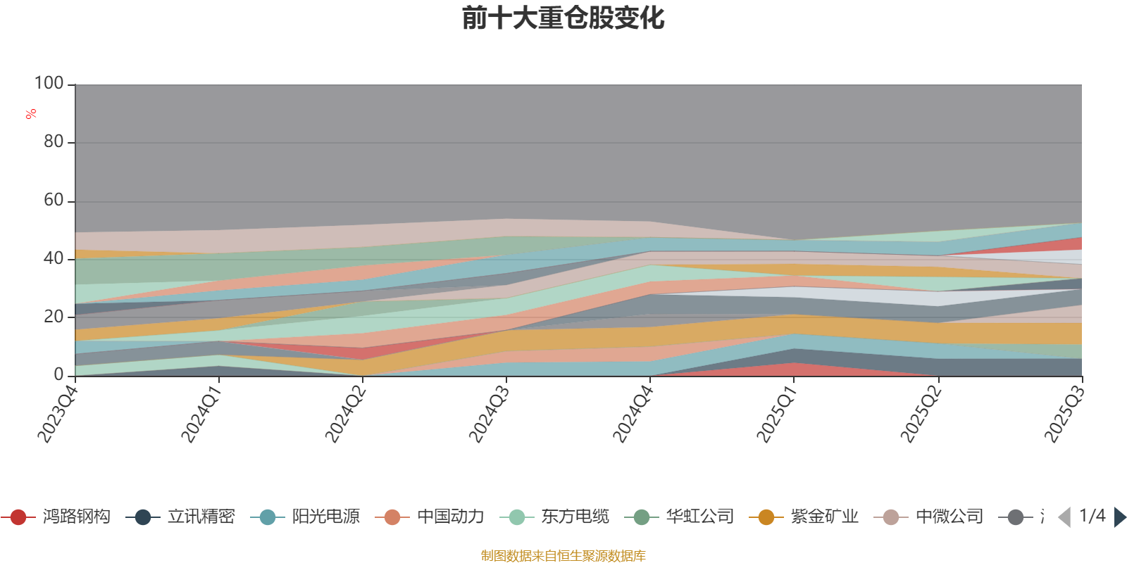 截至2025年三季度末,基金十大重仓股分别是紫金矿业、中微公司、立讯精密、宁德时代、银轮股份、金诚信、华虹公司、徐工机械、思特威、芯碁微装。