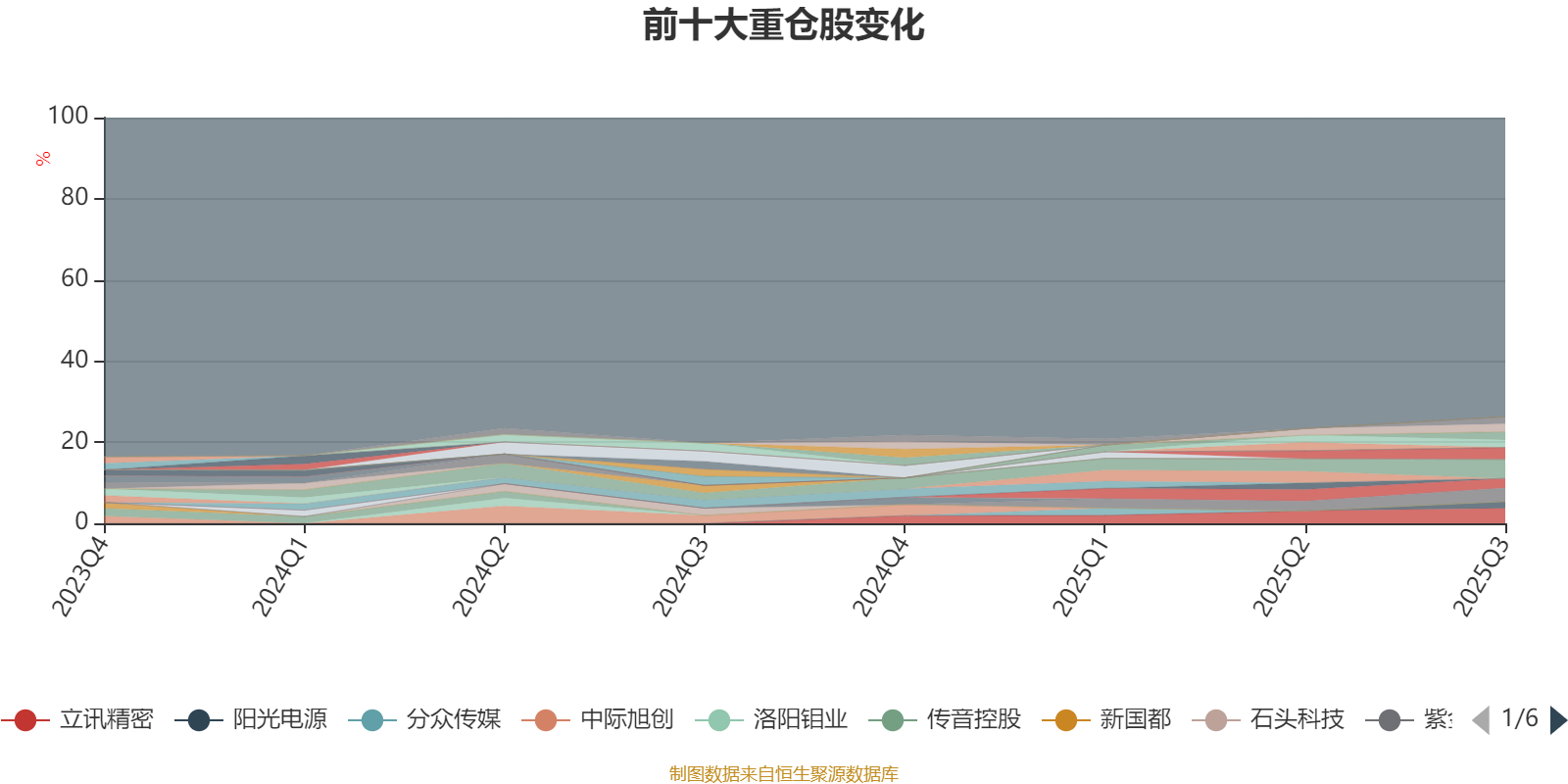 截至2025年三季度末,基金十大重仓股分别是宁德时代、立讯精密、紫金矿业、药明康德、美的集团、海尔智家、恒瑞医药、泸州老窖、中芯国际、阳光电源。