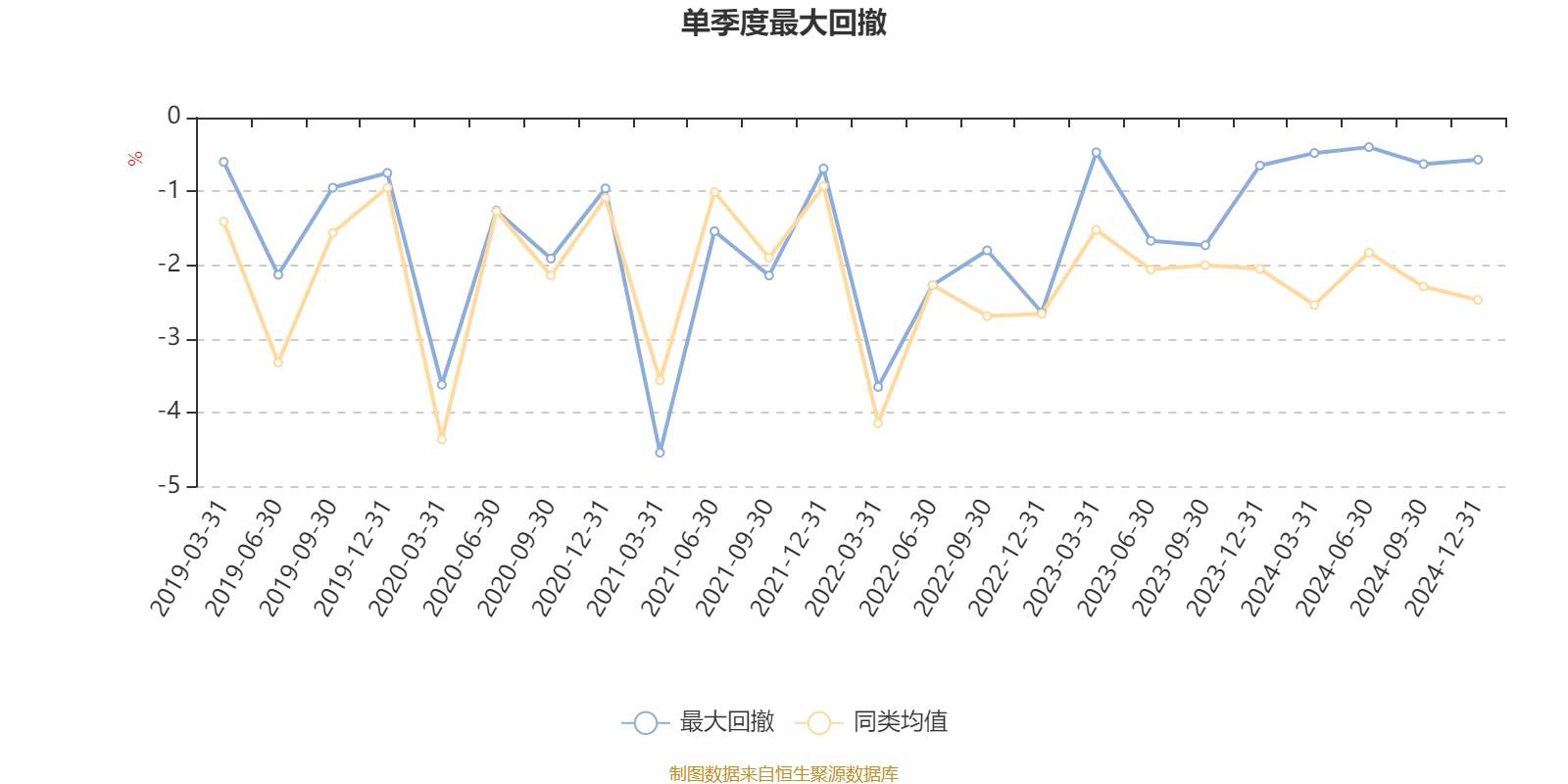 通过所选区间该基金净值增长率分位图,可以观察该基金与同类基金业绩比较情况。图为坐标原点到区间内某时点的净值增长率在同类基金中的分位数。