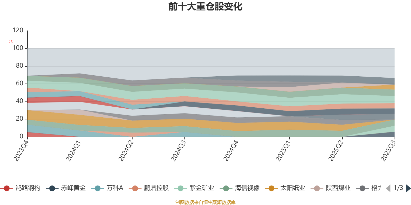 该基金持股集中度较高,近2年前十大重仓股集中度长期超过60%。截至2025年三季度末,基金十大重仓股分别是成都银行、纽威股份、海丰国际、海信视像、紫金矿业、招金矿业、常熟银行、亿联网络、赤峰黄金、山东黄金。