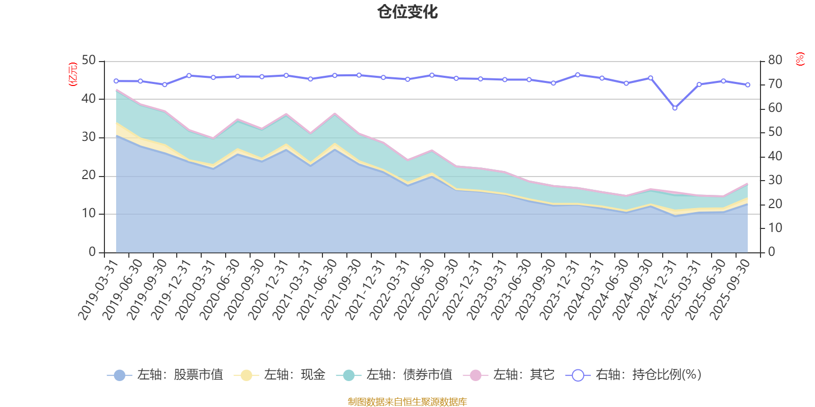 据定期报告数据统计,近三年平均股票仓位为70.91%,同类平均为72.35%。2023年末基金达到74.25%的最高仓位,2024年末最低,为60.38%。