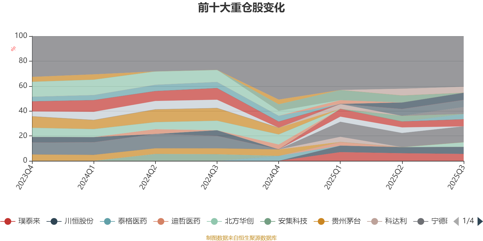 基金管理人在三季报中表示,本组合在三季度之前布局的方向在三季度基本没有变化。即整体坚守在:1)中国有全球竞争力、且产能周期逐步迈过拐点,或下游需求恢复明显的方向如半导体、国产算力、锂电池、风电等领域的龙头公司; 2)受益于供给侧反内卷的低位顺周期方向如上游资源的龙头公司; 这样两条主线上。随着科技与制造两大板块的整体上涨,组合对部分涨幅过大、未来收益空间有限的个股做了止盈。并逢低布局了部分涨幅落后、性价比凸显的消费行业的优质公司。