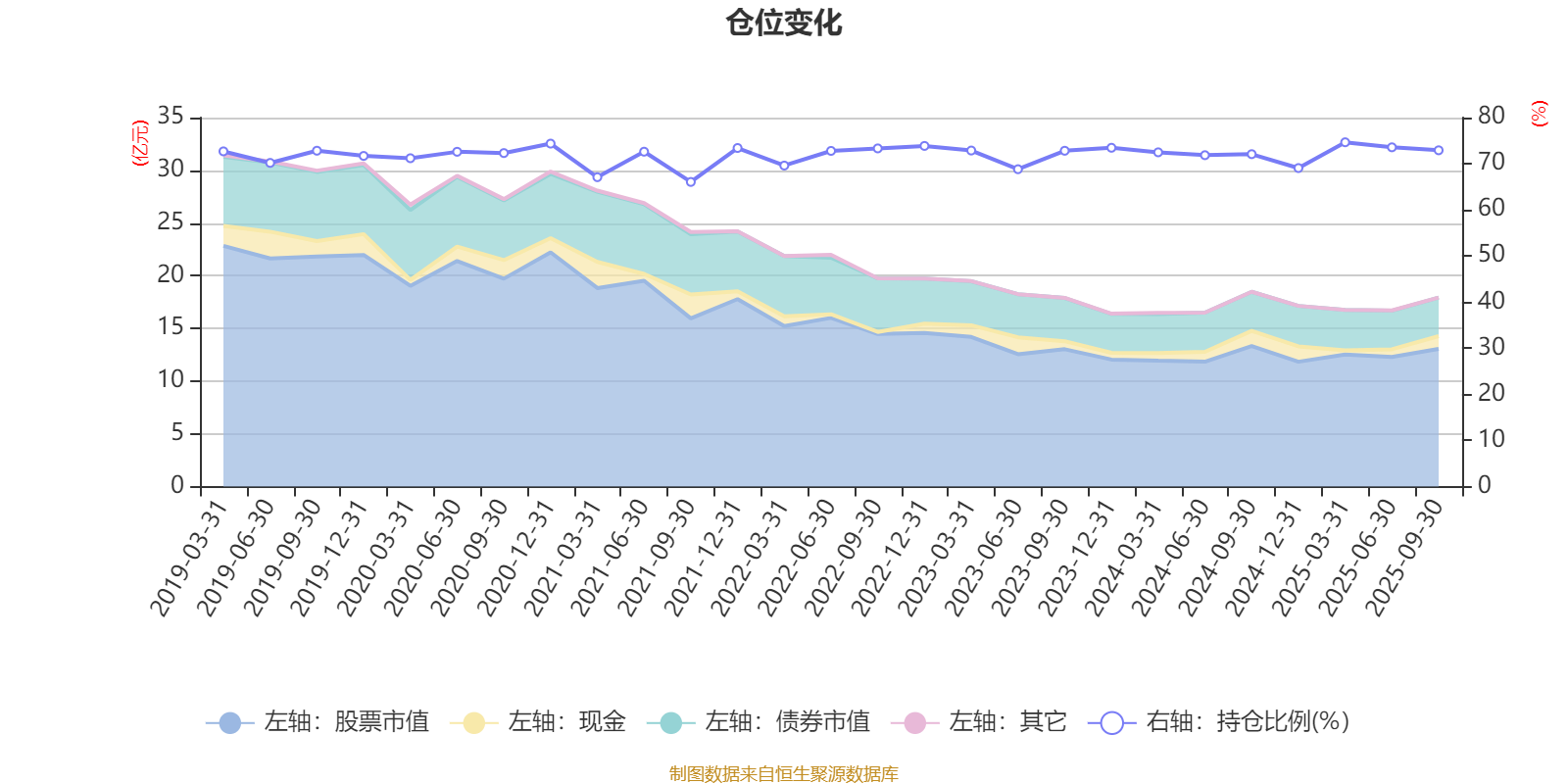 据定期报告数据统计,近三年平均股票仓位为72.36%,同类平均为72.35%。2025年一季度末基金达到74.65%的最高仓位,2021年三季度末最低,为66.05%。