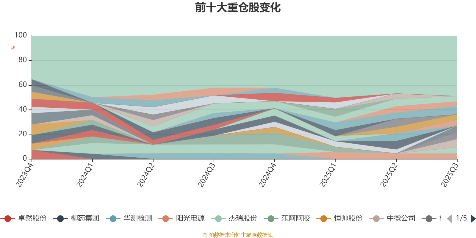 截至2025年三季度末,基金十大重仓股分别是中微公司、广联达、极米科技、宁德时代、杰瑞股份、江河集团、圣泉集团、阳光电源、科沃斯、思特威。