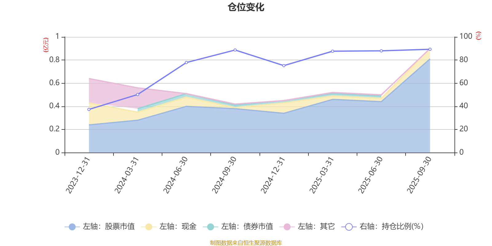 据定期报告数据统计,成立以来平均股票仓位为74.29%,同类平均为83.73%。2025年三季度末基金达到89.34%的最高仓位,2023年末最低,为37.37%。