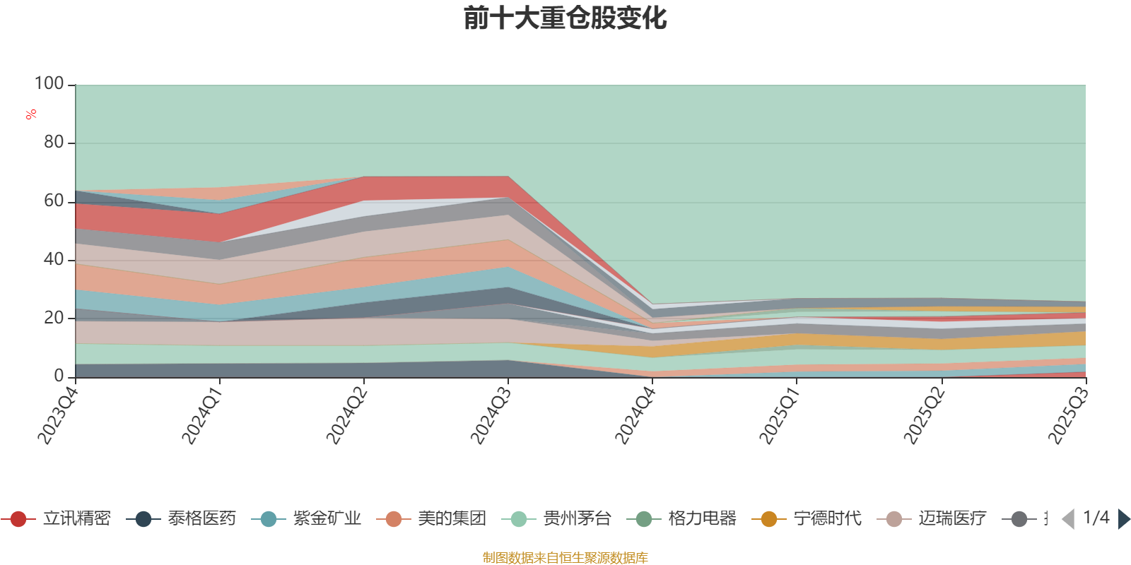截至2025年三季度末,基金十大重仓股分别是宁德时代、贵州茅台、紫金矿业、招商银行、美的集团、恒瑞医药、药明康德、兴业银行、立讯精密、中国平安。