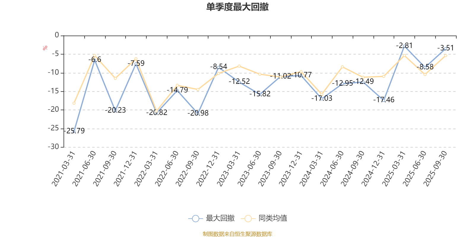 截至10月30日,基金近三年最大回撤为44.4%,同类可比基金排名216/251。单季度最大回撤出现在2021年一季度,为25.79%。