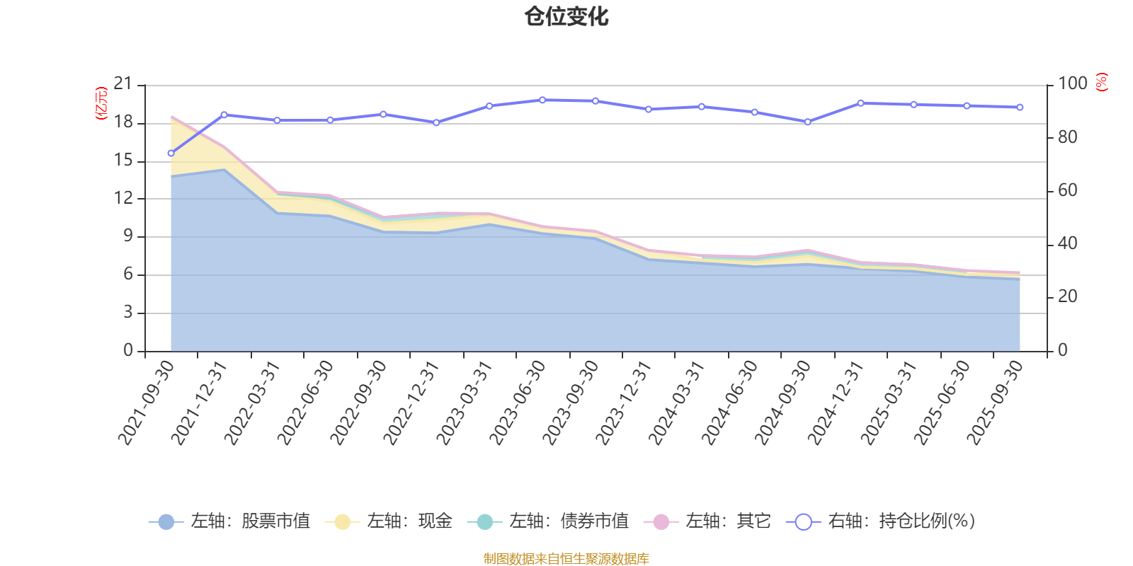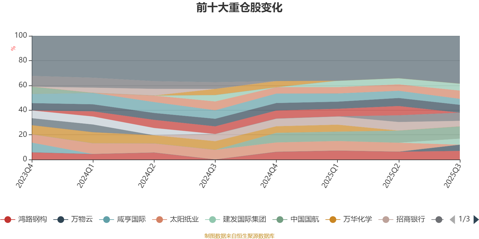 该基金持股集中度较高,近2年前十大重仓股集中度长期超过60%。截至2025年三季度末,基金十大重仓股分别是中国国航、鸿路钢构、龙湖集团、江河集团、宇新股份、华鲁恒升、万物云、建发国际集团、成都银行、招商银行。