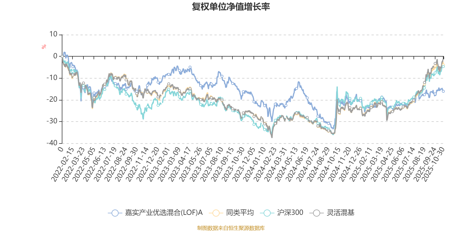 截至10月30日,嘉实产业优选混合(LOF)A近三个月复权单位净值增长率为1.88%,位于同类可比基金1093/1287;近半年复权单位净值增长率为11.93%,位于同类可比基金970/1287;近一年复权单位净值增长率为8.45%,位于同类可比基金1034/1287;近三年复权单位净值增长率为2.03%,位于同类可比基金978/1286。