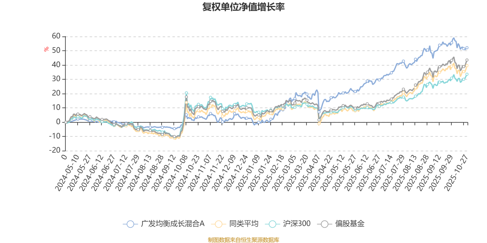截至10月27日,广发均衡成长混合A近三个月复权单位净值增长率为7.76%,位于同类可比基金483/621;近半年复权单位净值增长率为29.91%,位于同类可比基金301/619;近一年复权单位净值增长率为46.84%,位于同类可比基金132/611。