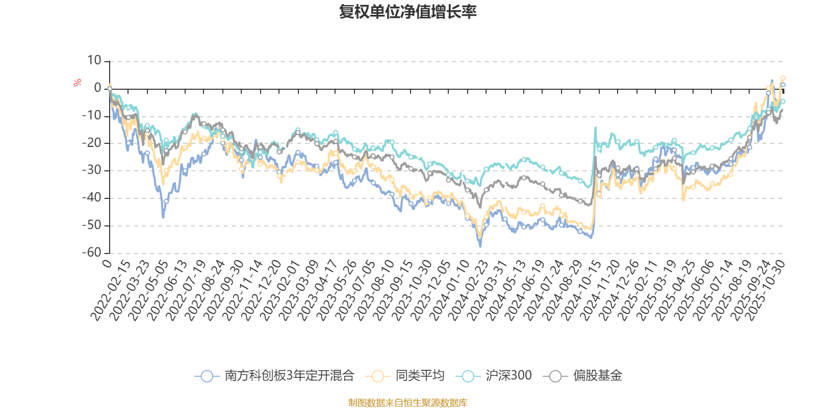 截至10月30日,南方科创板3年定开混合近三个月复权单位净值增长率为32.48%,位于同类可比基金122/229;近半年复权单位净值增长率为41.41%,位于同类可比基金153/229;近一年复权单位净值增长率为59.20%,位于同类可比基金94/214;近三年复权单位净值增长率为35.30%,位于同类可比基金95/158。