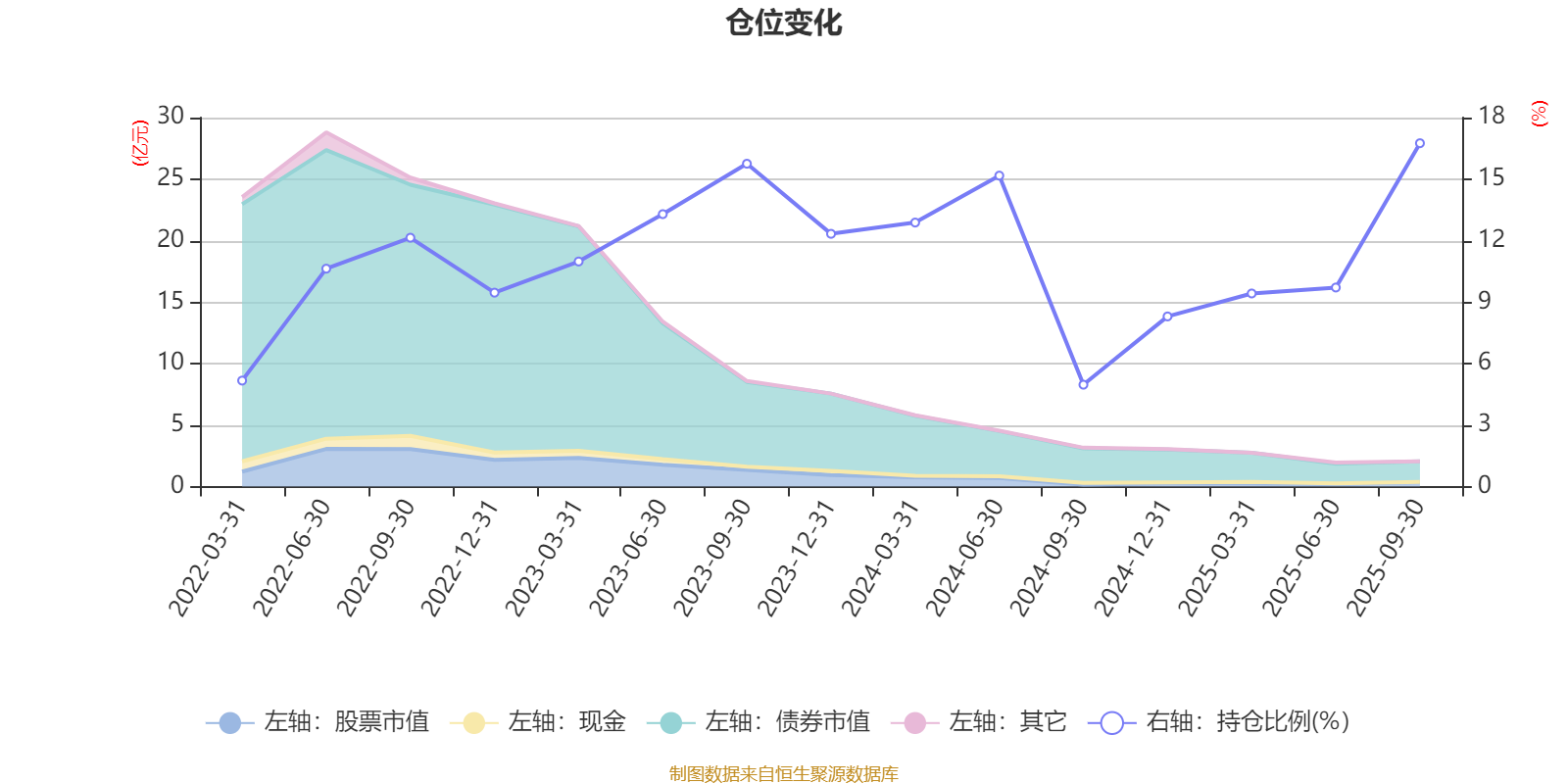 据定期报告数据统计,近三年平均股票仓位为11.58%,同类平均为19.14%。2025年三季度末基金达到16.75%的最高仓位,2024年三季度末最低,为4.97%。