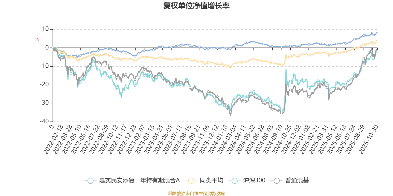 截至10月30日,嘉实民安添复一年持有期混合A近三个月复权单位净值增长率为2.82%,位于同类可比基金277/629;近半年复权单位净值增长率为5.81%,位于同类可比基金293/629;近一年复权单位净值增长率为7.24%,位于同类可比基金322/623;近三年复权单位净值增长率为10.55%,位于同类可比基金337/557。