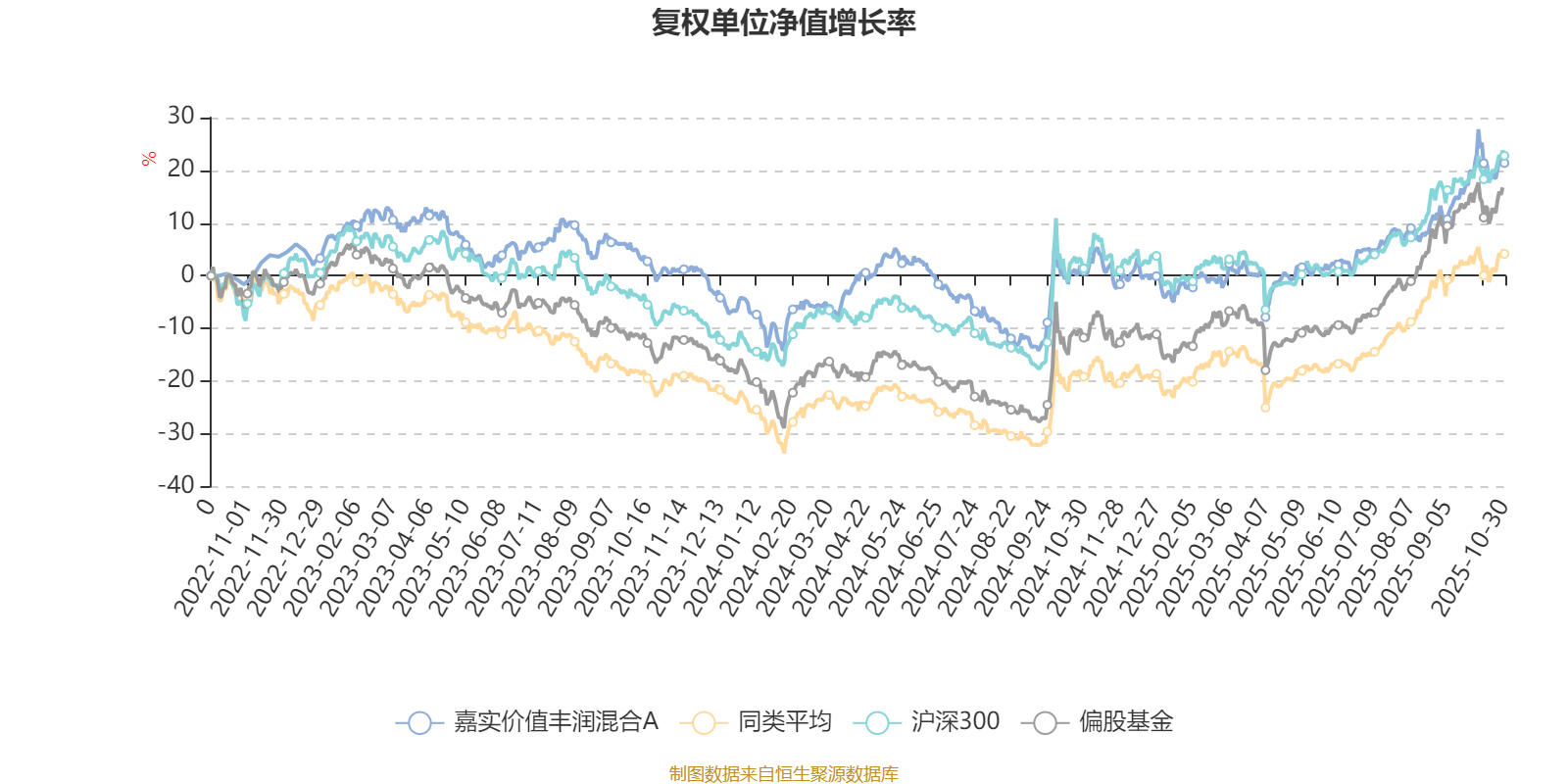 截至10月30日,嘉实价值丰润混合A近三个月复权单位净值增长率为12.15%,位于同类可比基金369/689;近半年复权单位净值增长率为21.87%,位于同类可比基金443/688;近一年复权单位净值增长率为20.33%,位于同类可比基金442/658;近三年复权单位净值增长率为23.40%,位于同类可比基金147/364。