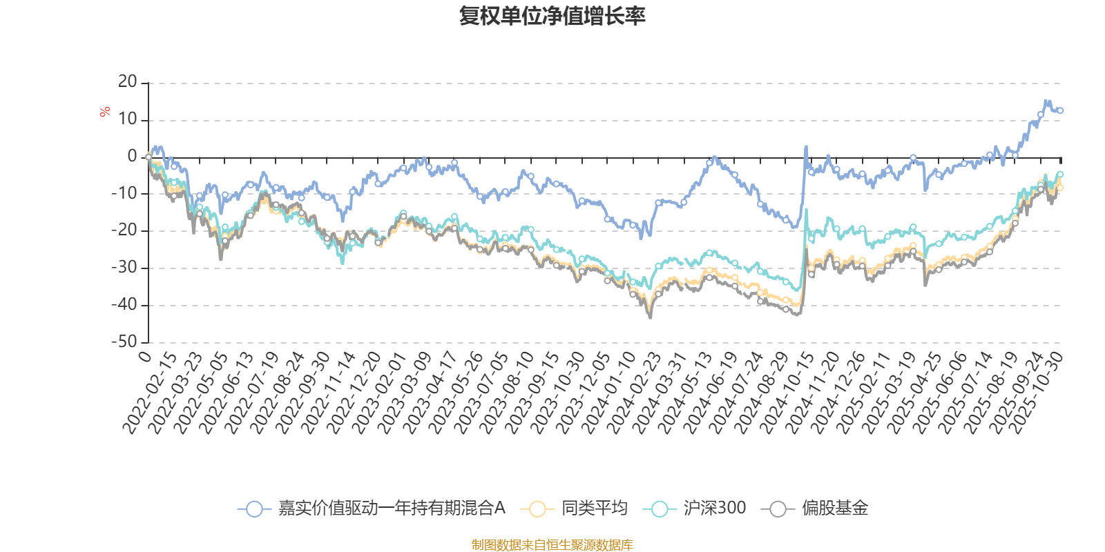截至10月30日,嘉实价值驱动一年持有期混合A近三个月复权单位净值增长率为12.32%,位于同类可比基金80/130;近半年复权单位净值增长率为19.90%,位于同类可比基金92/130;近一年复权单位净值增长率为16.97%,位于同类可比基金102/130;近三年复权单位净值增长率为33.36%,位于同类可比基金47/124。