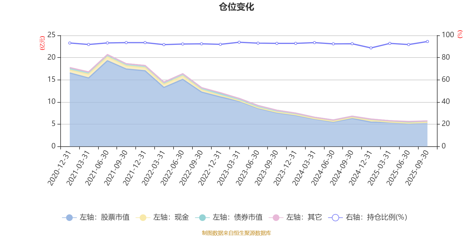 据定期报告数据统计,近三年平均股票仓位为92.56%,同类平均为85.99%。2025年三季度末基金达到94.51%的最高仓位,2024年末最低,为88.73%。
