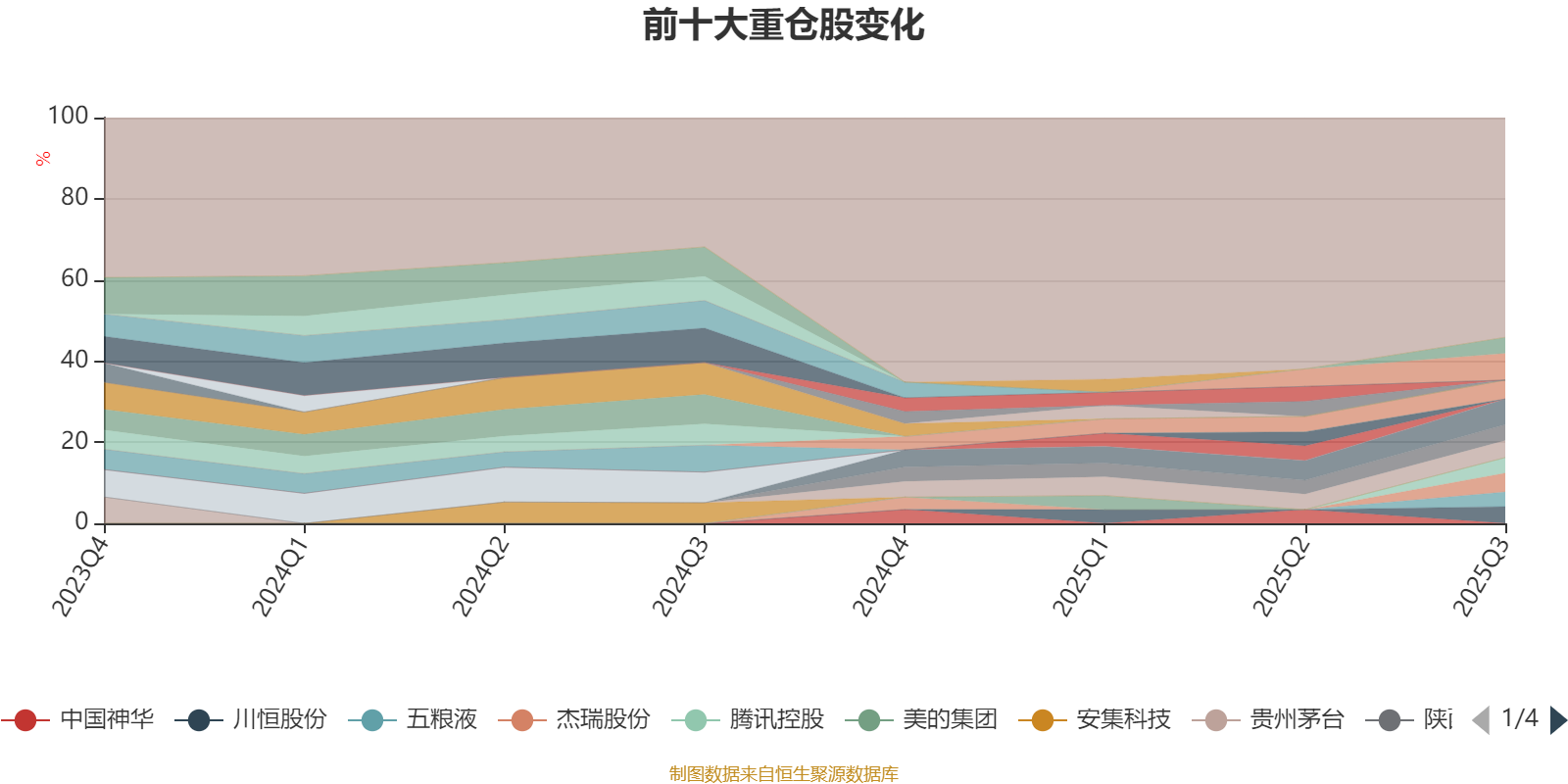 截至2025年三季度末,基金十大重仓股分别是阿里巴巴-W、宁德时代、药明康德、杰瑞股份、贵州茅台、川恒股份、山西汾酒、陕西煤业、腾讯控股、五粮液。