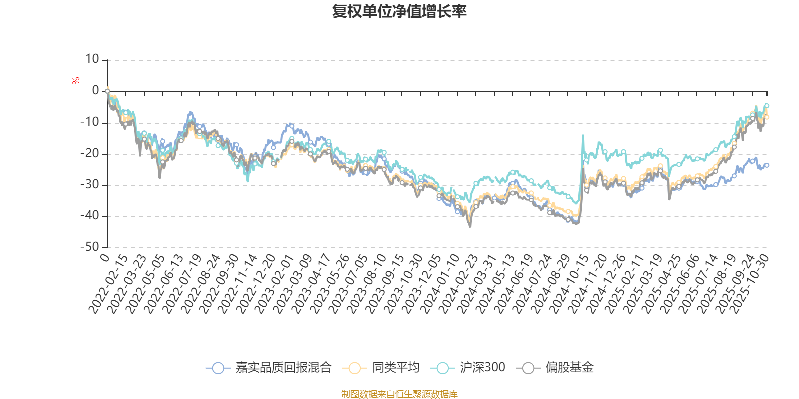 截至10月30日,嘉实品质回报混合近三个月复权单位净值增长率为5.56%,位于同类可比基金107/130;近半年复权单位净值增长率为10.70%,位于同类可比基金118/130;近一年复权单位净值增长率为8.43%,位于同类可比基金122/130;近三年复权单位净值增长率为4.12%,位于同类可比基金102/124。