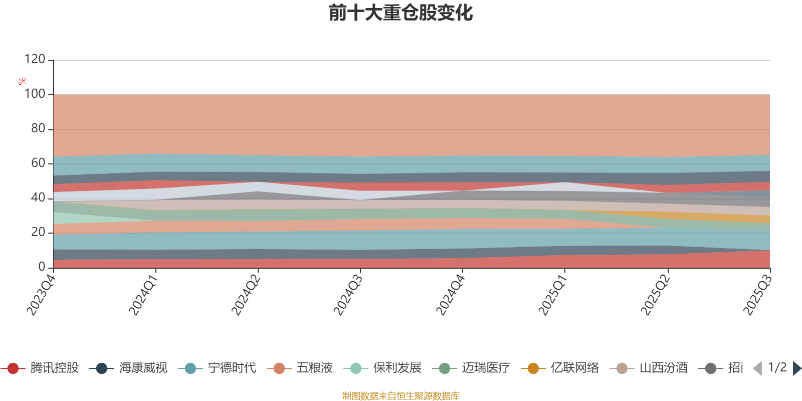 该基金持股集中度较高,且持股标的较为稳定,近2年前十大重仓股集中度长期超过60%。截至2025年三季度末,基金十大重仓股分别是宁德时代、腾讯控股、贵州茅台、海大集团、招商银行、山西汾酒、星宇股份、亿联网络、药明康德、迈瑞医疗。