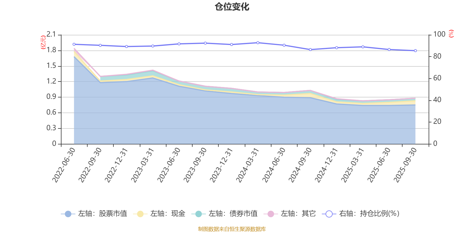 据定期报告数据统计,近三年平均股票仓位为89.42%,同类平均为83.73%。2024年一季度末基金达到92.74%的最高仓位,2025年三季度末最低,为85.49%。