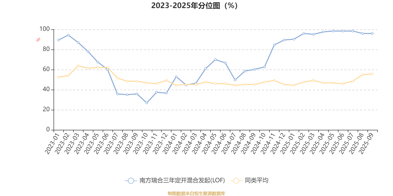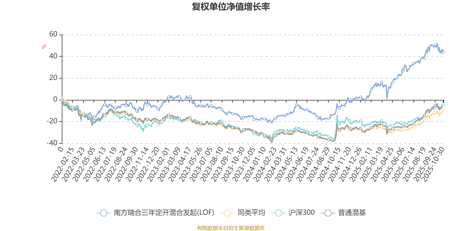 截至10月30日,南方瑞合三年定开混合发起(LOF)近三个月复权单位净值增长率为5.95%,位于同类可比基金97/134;近半年复权单位净值增长率为21.05%,位于同类可比基金67/134;近一年复权单位净值增长率为52.15%,位于同类可比基金10/130;近三年复权单位净值增长率为59.39%,位于同类可比基金7/119。