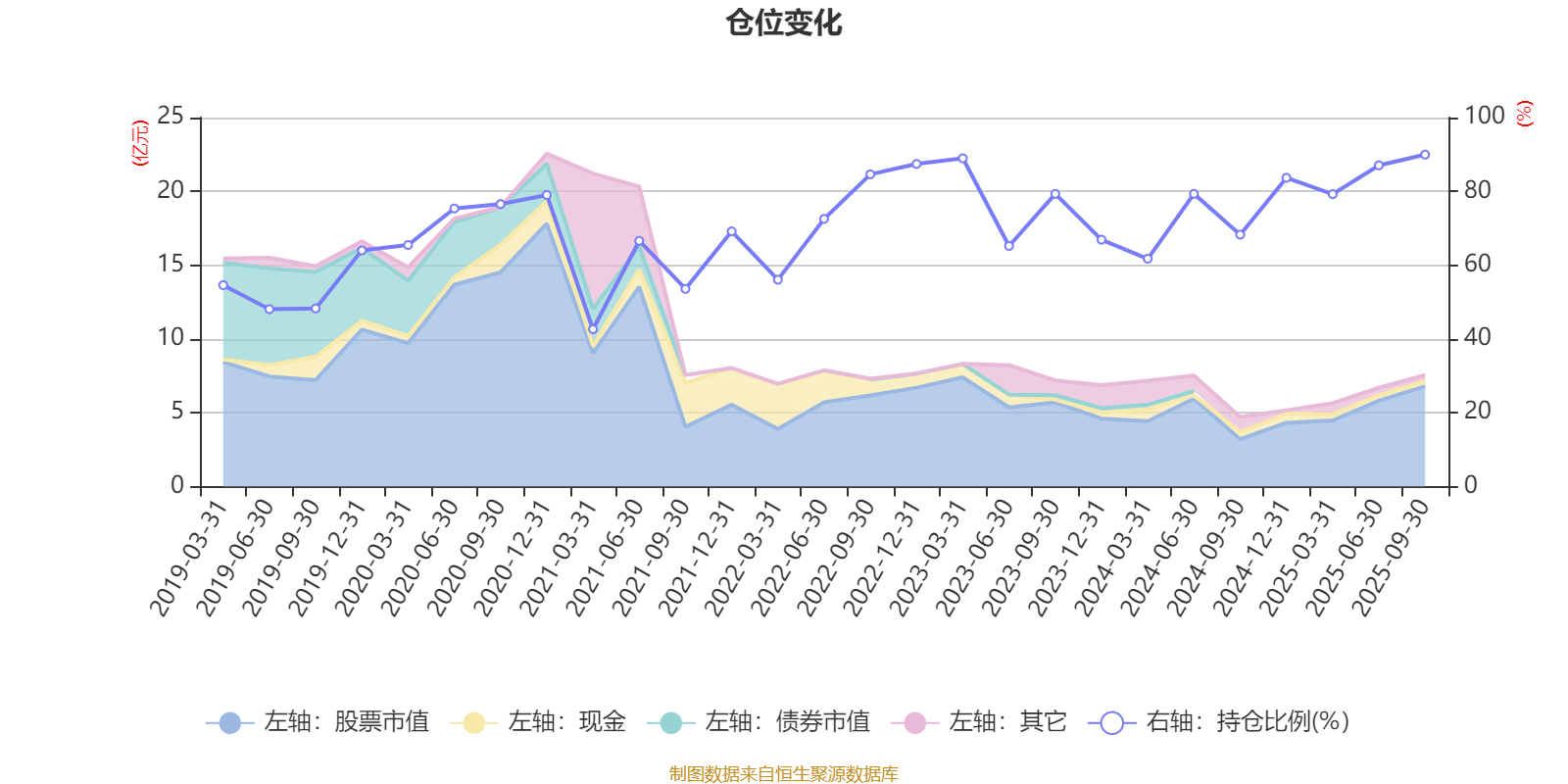 据定期报告数据统计,近三年平均股票仓位为78.1%,同类平均为67.37%。2025年三季度末基金达到89.97%的最高仓位,2021年一季度末最低,为42.63%。