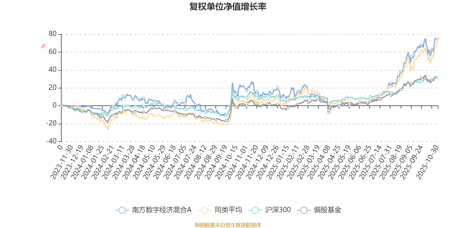 截至10月30日,南方数字经济混合A近三个月复权单位净值增长率为42.06%,位于同类可比基金71/229;近半年复权单位净值增长率为71.72%,位于同类可比基金67/229;近一年复权单位净值增长率为46.85%,位于同类可比基金143/214。