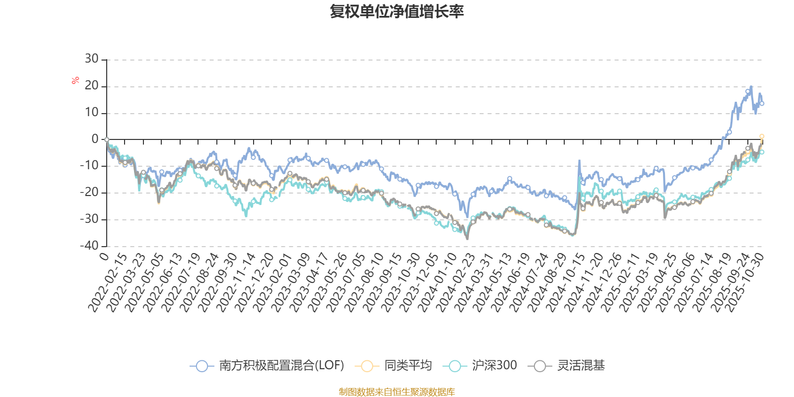 截至10月30日,南方积极配置混合(LOF)近三个月复权单位净值增长率为15.97%,位于同类可比基金483/1287;近半年复权单位净值增长率为32.42%,位于同类可比基金440/1287;近一年复权单位净值增长率为32.37%,位于同类可比基金429/1287;近三年复权单位净值增长率为22.82%,位于同类可比基金516/1286。