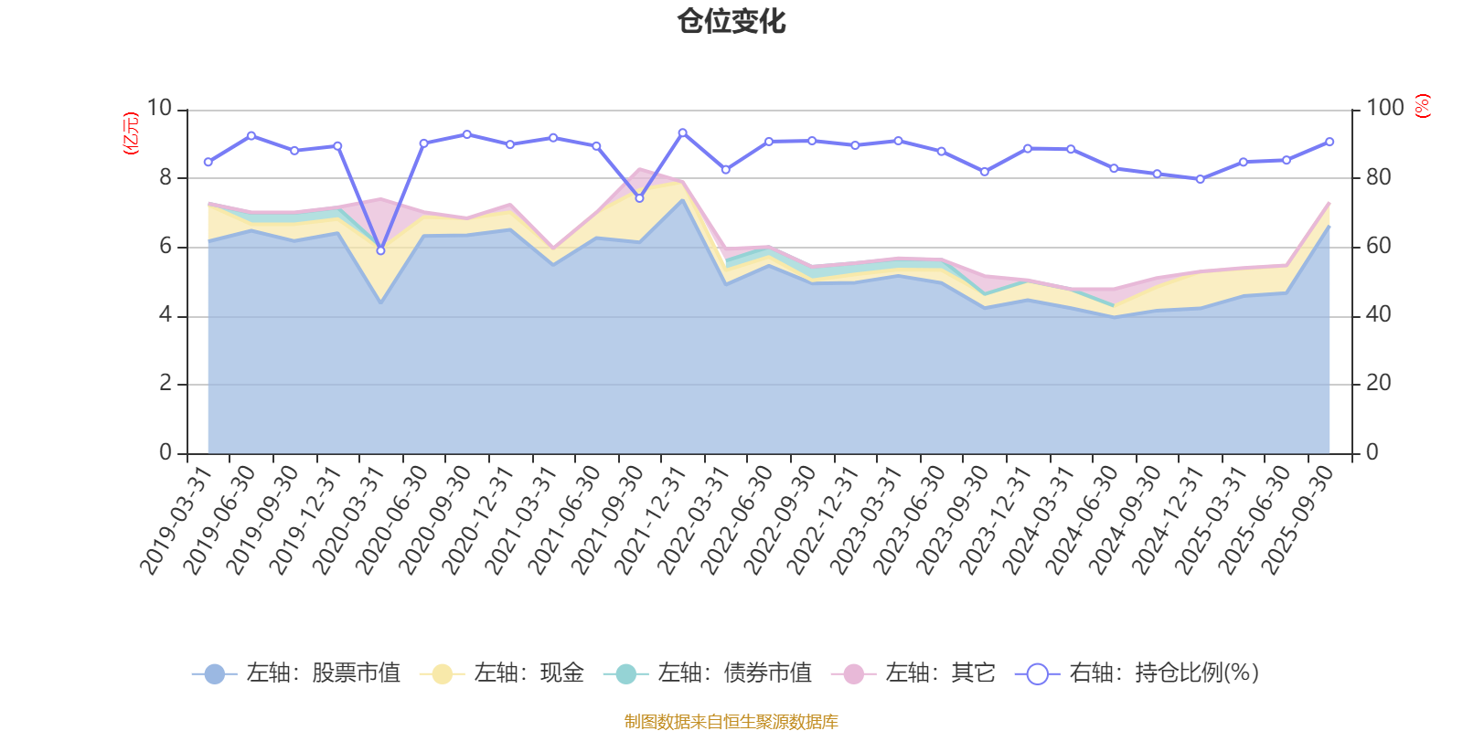 据定期报告数据统计,近三年平均股票仓位为86.05%,同类平均为72.35%。2021年末基金达到93.29%的最高仓位,2020年一季度末最低,为59%。