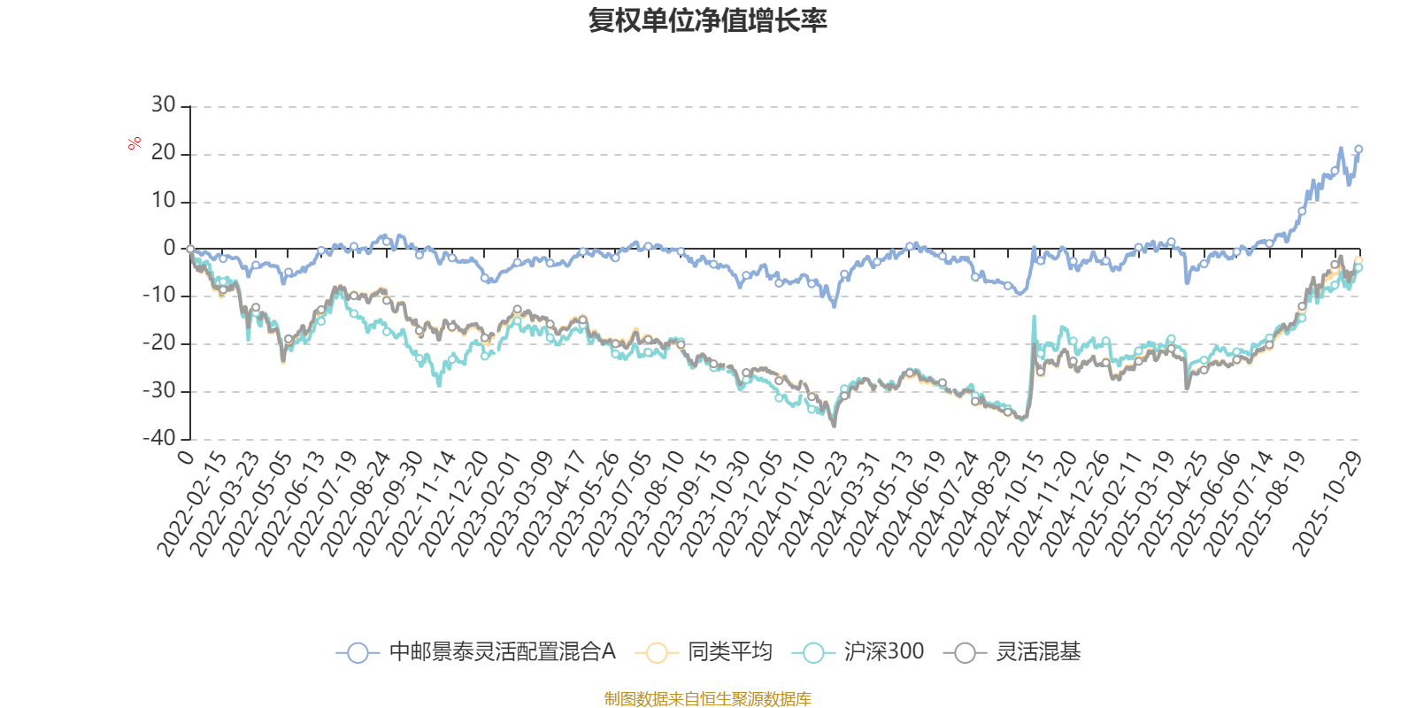 截至10月29日,中邮景泰灵活配置混合A近三个月复权单位净值增长率为17.09%,位于同类可比基金465/1287;近半年复权单位净值增长率为24.59%,位于同类可比基金653/1287;近一年复权单位净值增长率为23.30%,位于同类可比基金662/1287;近三年复权单位净值增长率为24.02%,位于同类可比基金509/1286。