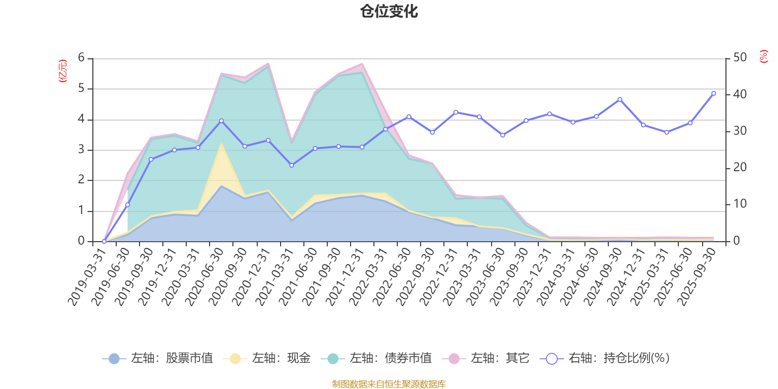 据定期报告数据统计,近三年平均股票仓位为33.84%,同类平均为72.35%。2025年三季度末基金达到40.44%的最高仓位,2019年上半年末最低,为10%。