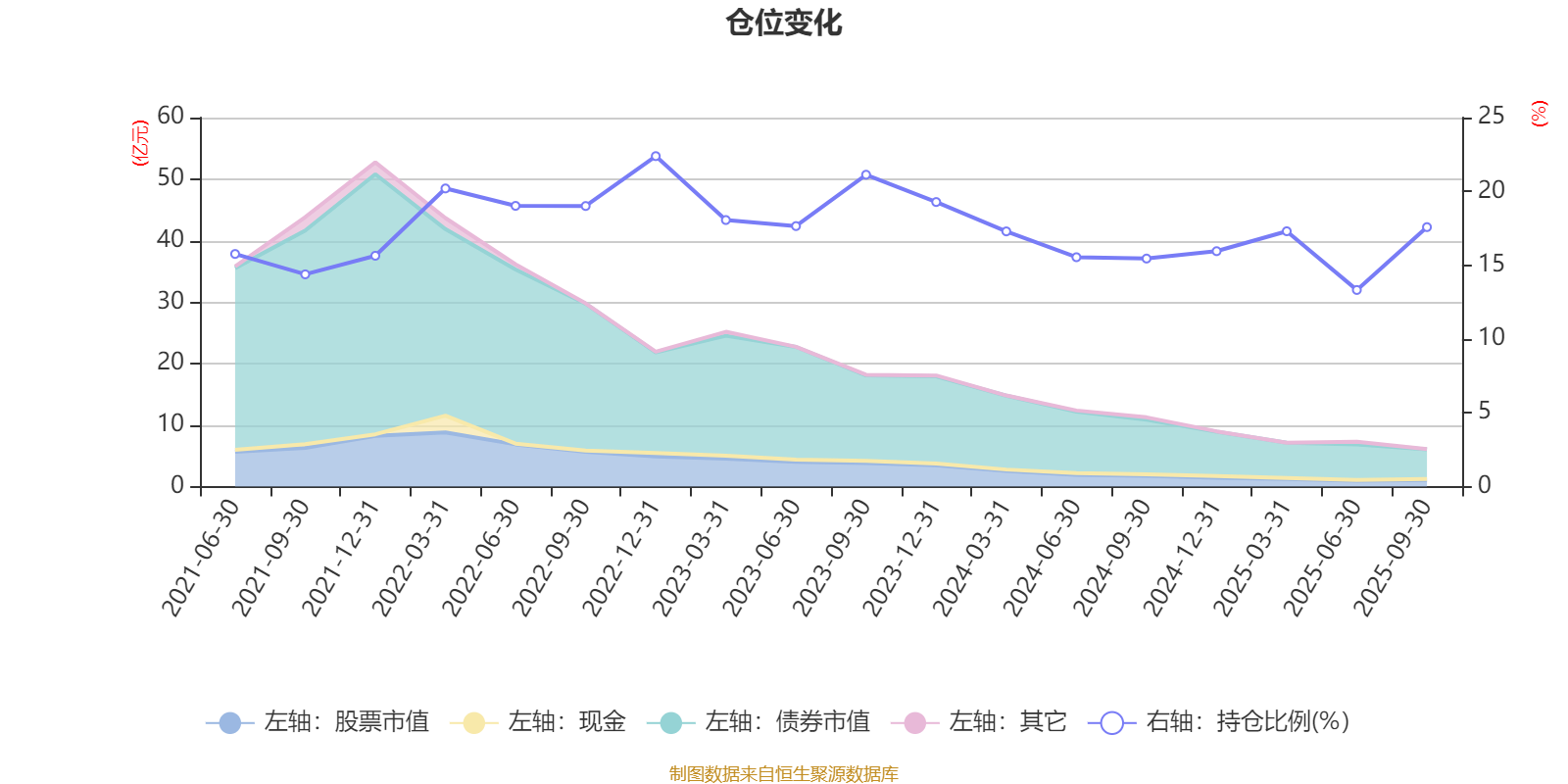 据定期报告数据统计,近三年平均股票仓位为17.58%,同类平均为19.14%。2022年末基金达到22.39%的最高仓位,2025年上半年末最低,为13.32%。