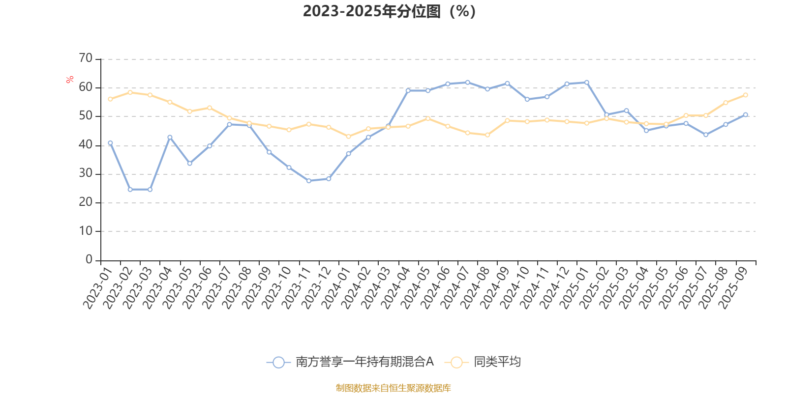 通过所选区间该基金净值增长率分位图,可以观察该基金与同类基金业绩比较情况。图为坐标原点到区间内某时点的净值增长率在同类基金中的分位数。