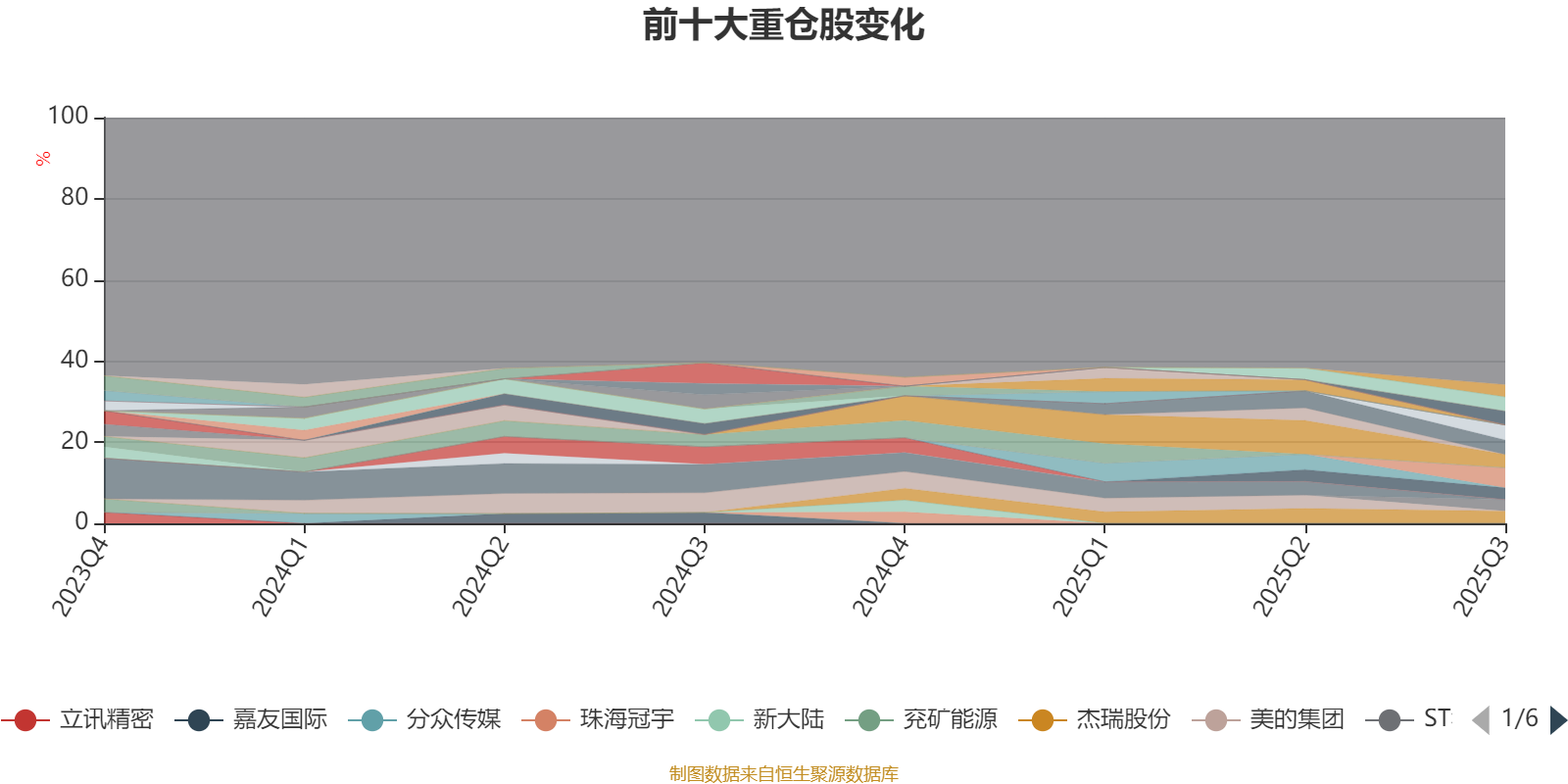 截至2025年三季度末,基金十大重仓股分别是生益科技、寒武纪、药明康德、云铝股份、拓荆科技、渝农商行、杰瑞股份、联赢激光、宁德时代、ST华通。