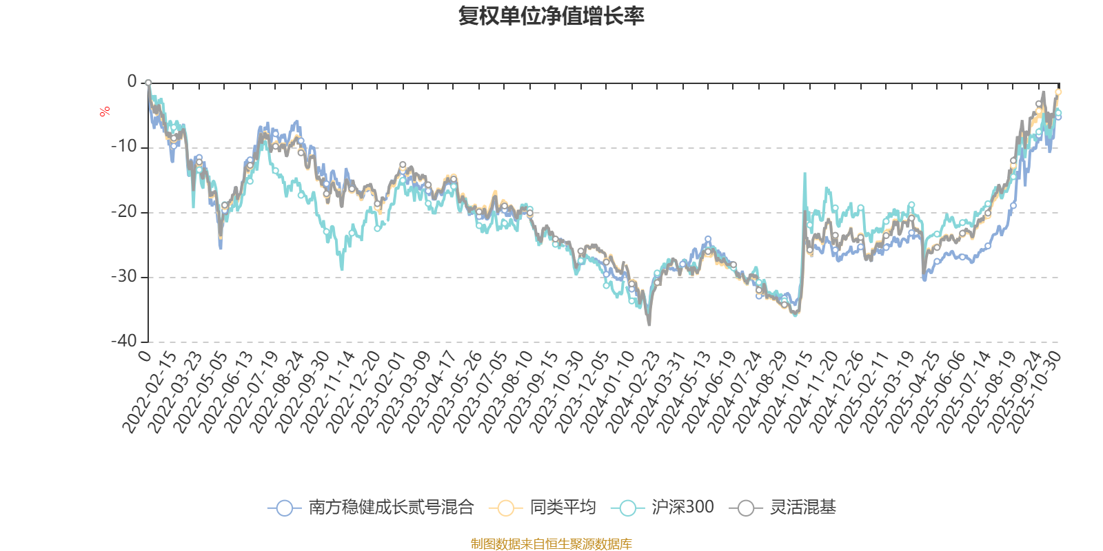 截至10月30日,南方稳健成长贰号混合近三个月复权单位净值增长率为21.71%,位于同类可比基金326/1287;近半年复权单位净值增长率为31.15%,位于同类可比基金453/1287;近一年复权单位净值增长率为28.03%,位于同类可比基金529/1287;近三年复权单位净值增长率为15.85%,位于同类可比基金664/1286。