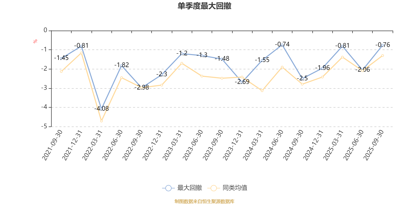 截至10月29日,基金近三年最大回撤为4.44%,同类可比基金排名145/534。单季度最大回撤出现在2022年一季度,为4.08%。