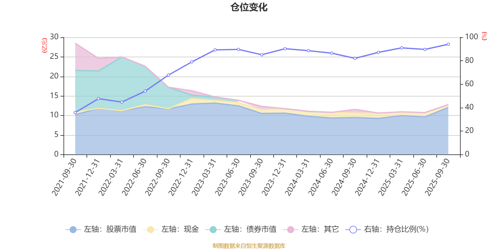 据定期报告数据统计,近三年平均股票仓位为87.74%,同类平均为72.35%。2025年三季度末基金达到94.11%的最高仓位,2021年三季度末最低,为35.88%。