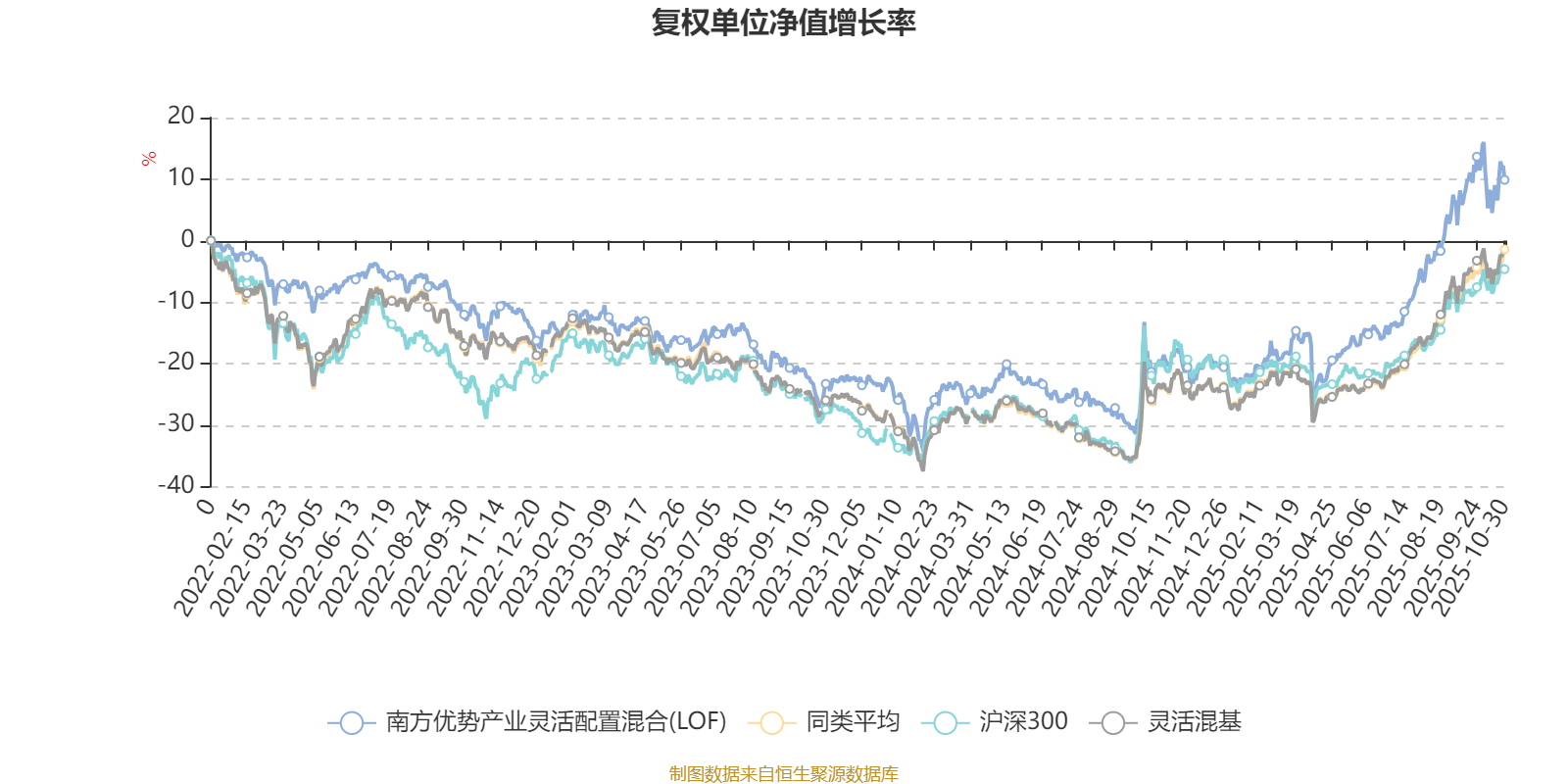 截至10月30日,南方优势产业灵活配置混合(LOF)近三个月复权单位净值增长率为15.20%,位于同类可比基金508/1287;近半年复权单位净值增长率为36.50%,位于同类可比基金353/1287;近一年复权单位净值增长率为37.04%,位于同类可比基金332/1287;近三年复权单位净值增长率为30.05%,位于同类可比基金382/1286。