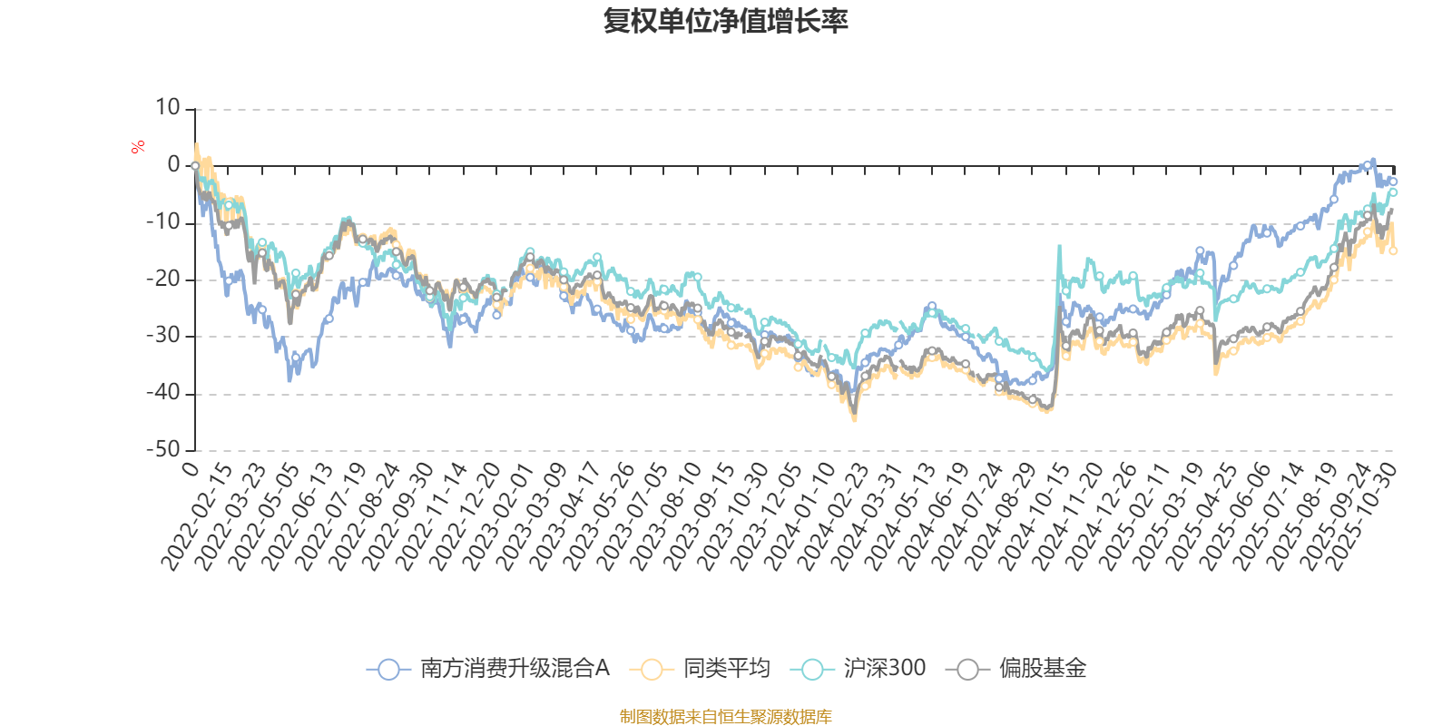 截至10月30日,南方消费升级混合A近三个月复权单位净值增长率为6.62%,位于同类可比基金222/265;近半年复权单位净值增长率为15.87%,位于同类可比基金229/265;近一年复权单位净值增长率为30.15%,位于同类可比基金130/265;近三年复权单位净值增长率为41.34%,位于同类可比基金53/253。